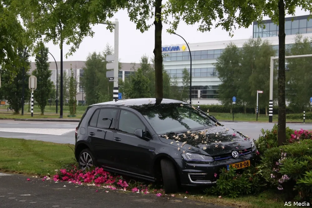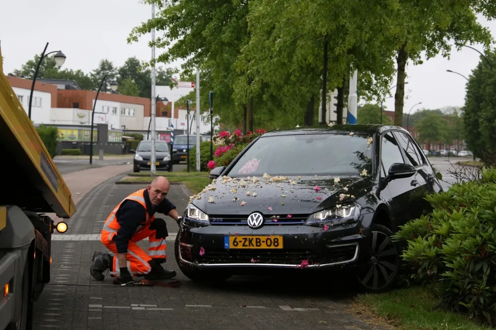 Een berger heeft de auto uit de bloemenperk getrokken, de auto had een lekke achterband en schade aan een velg.