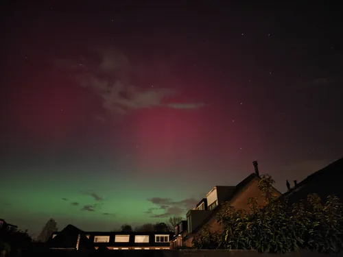 Naast dat het Noorderlicht in de noordelijke richting was te zien met een rode en groene gloed, was er dit keer ook een felle groene strook te zien recht boven Nederland. Dit geeft aan dat het een behoorlijk sterke geomagnetische storm betrof waarbij de aurora een stuk zuidelijker kwam dan gebruikelijk.
