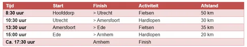 De collega’s van CROP streven ernaar de 135 kilometer lange route binnen 10 uur af te leggen. Een ambitieus doel, dat met teamwork zeker haalbaar is. Om 8:30 uur vertrekt de eerste groep wielrenners vanuit Hoofddorp en rond 17:30 uur wordt de laatste groep hardlopers verwacht bij de finish in Arnhem. Globaal ziet de planning er als volgt uit.